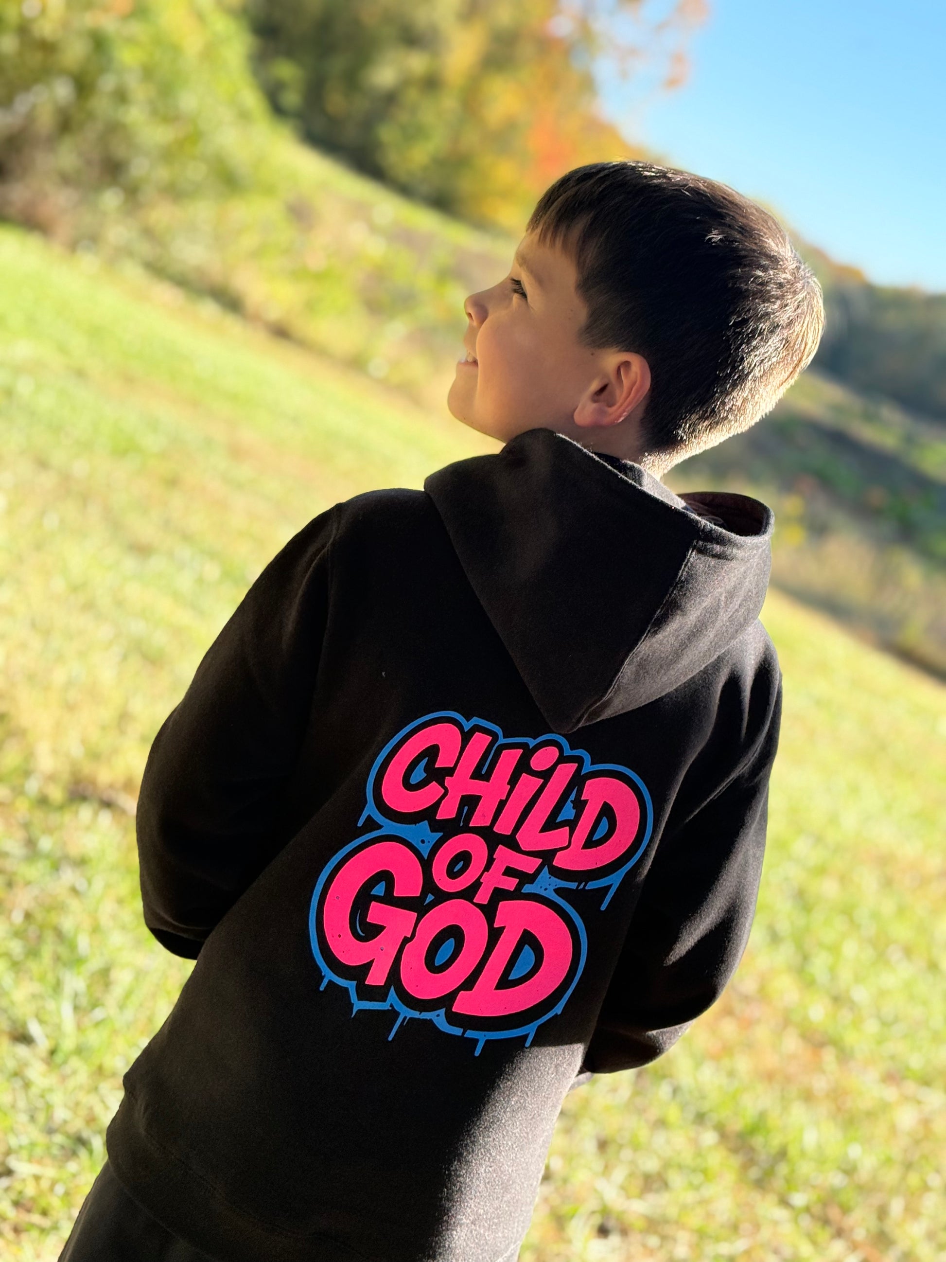 Soft fleece hooded sweatshirt with CHILD OF GOD on the back in neon pink and neon blue.