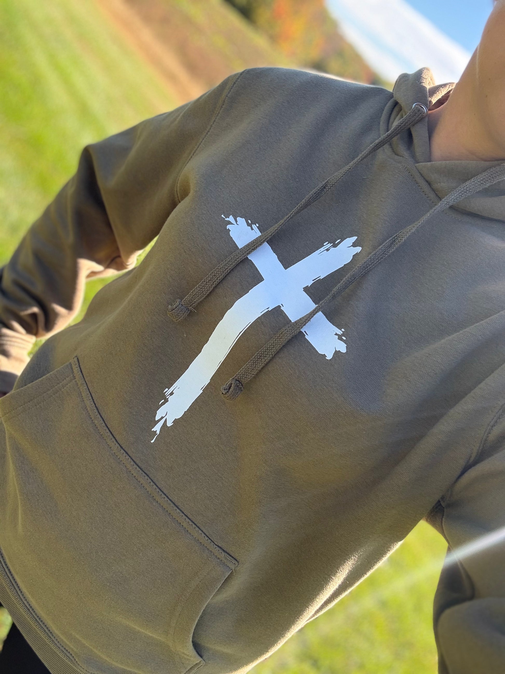 Soft fleece hooded sweatshirt with a cross silkscreened in white ink.