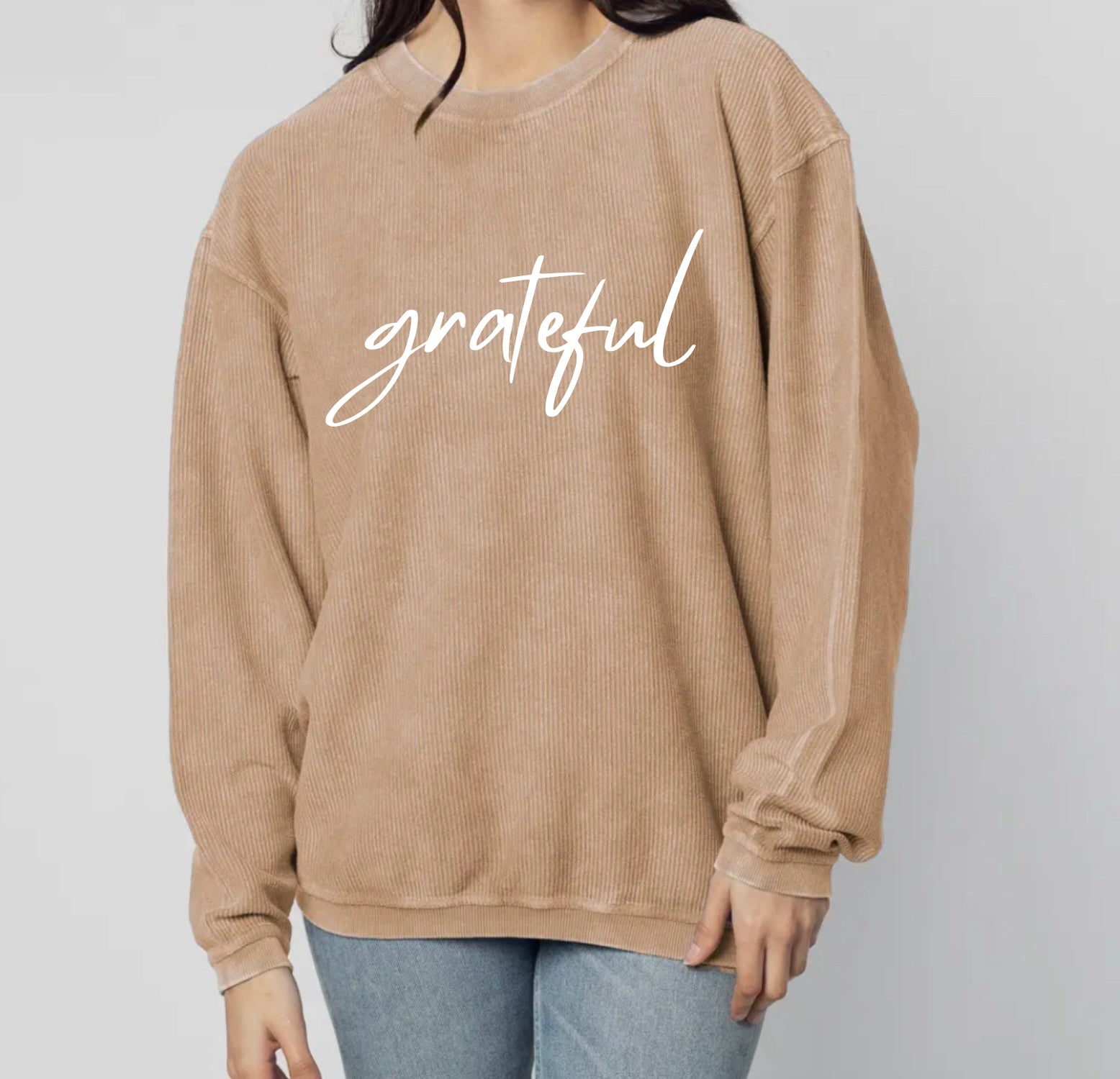 Grateful is screen printed across the front of this beautiful corded crew in white ink. Available in two colors; latte and maroon.