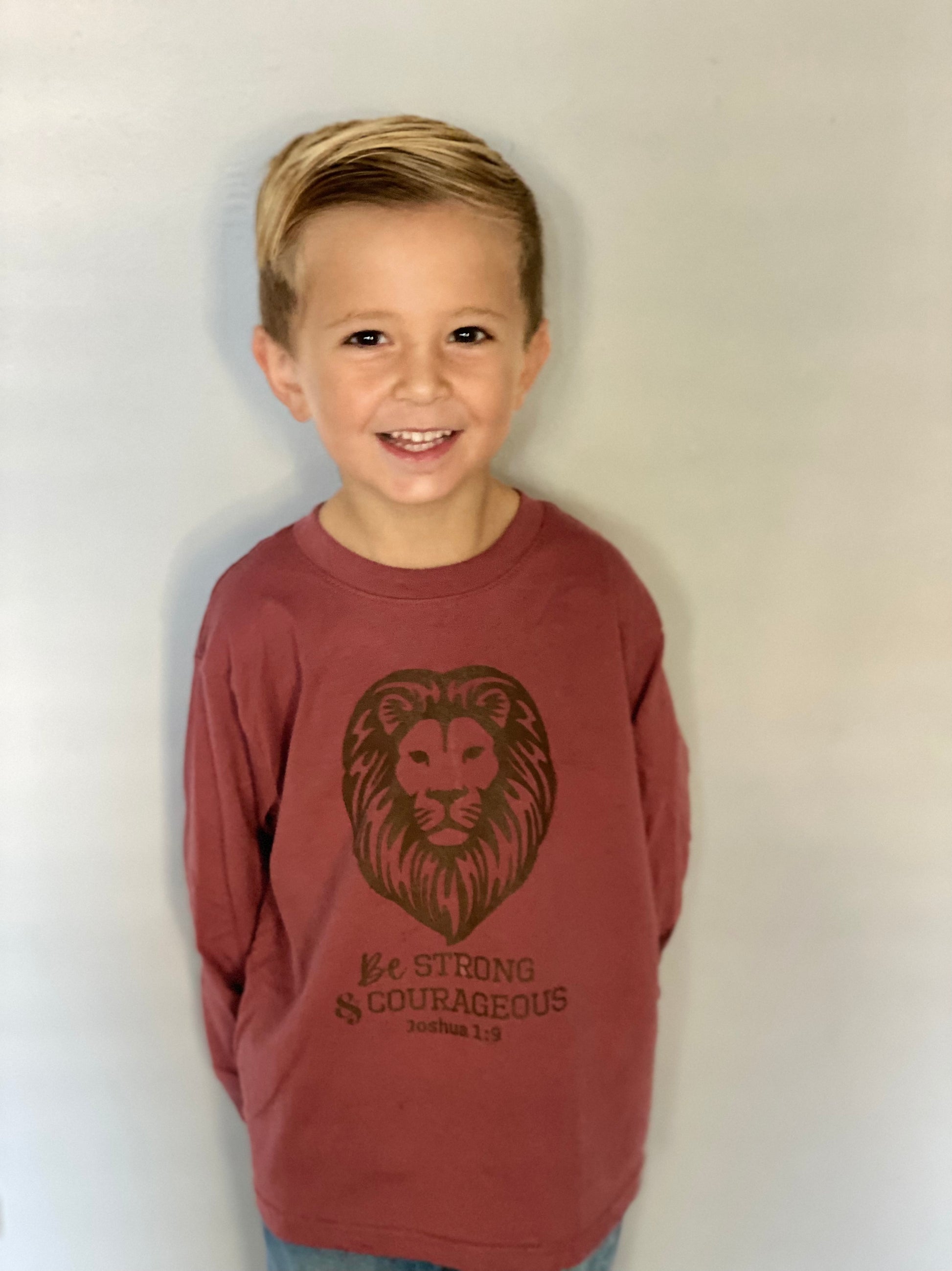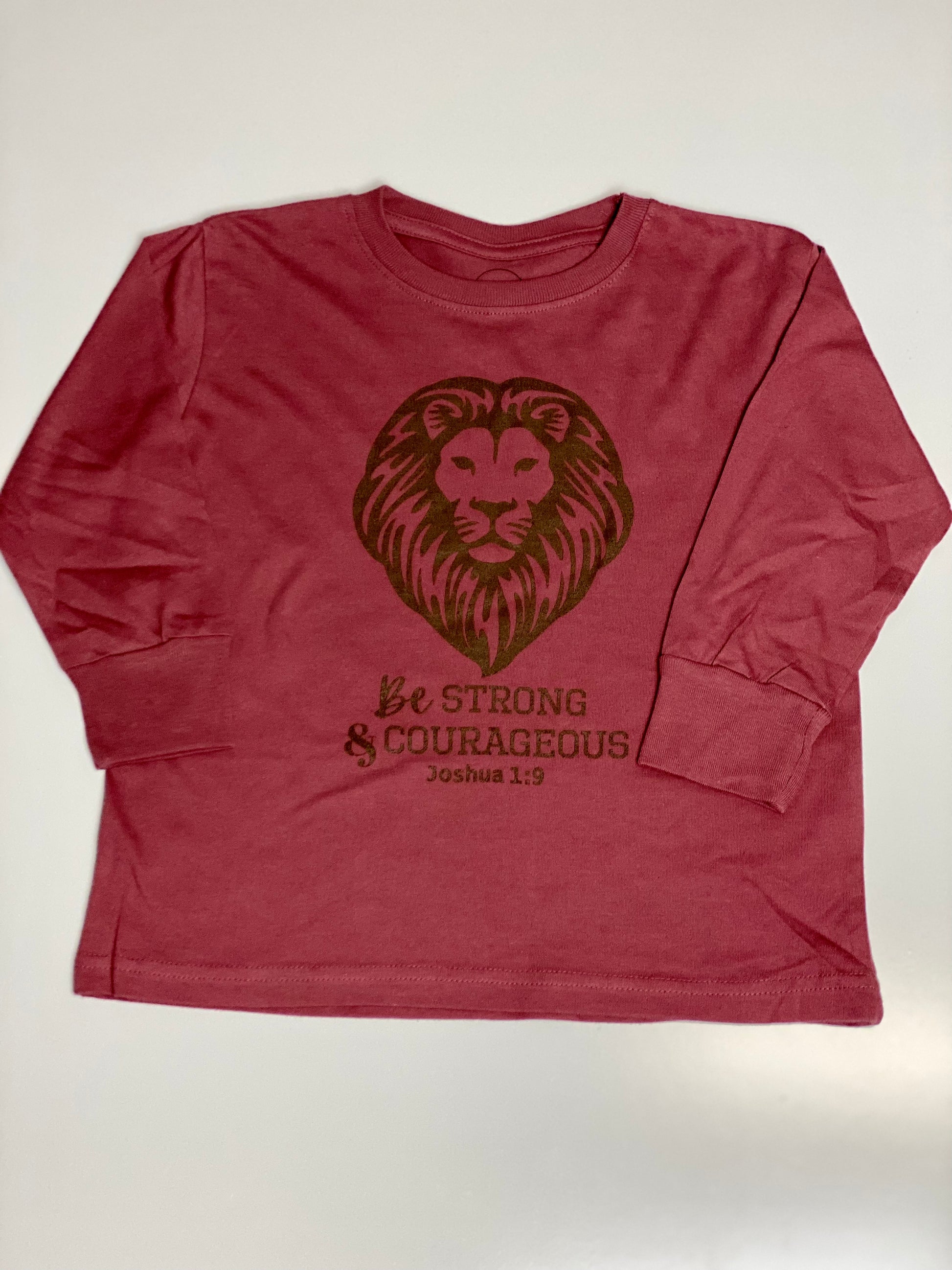 Perfect shirt for fall with its maroon coloring and brown ink. The lion reminds them to be strong and courageous because God is always by their side.