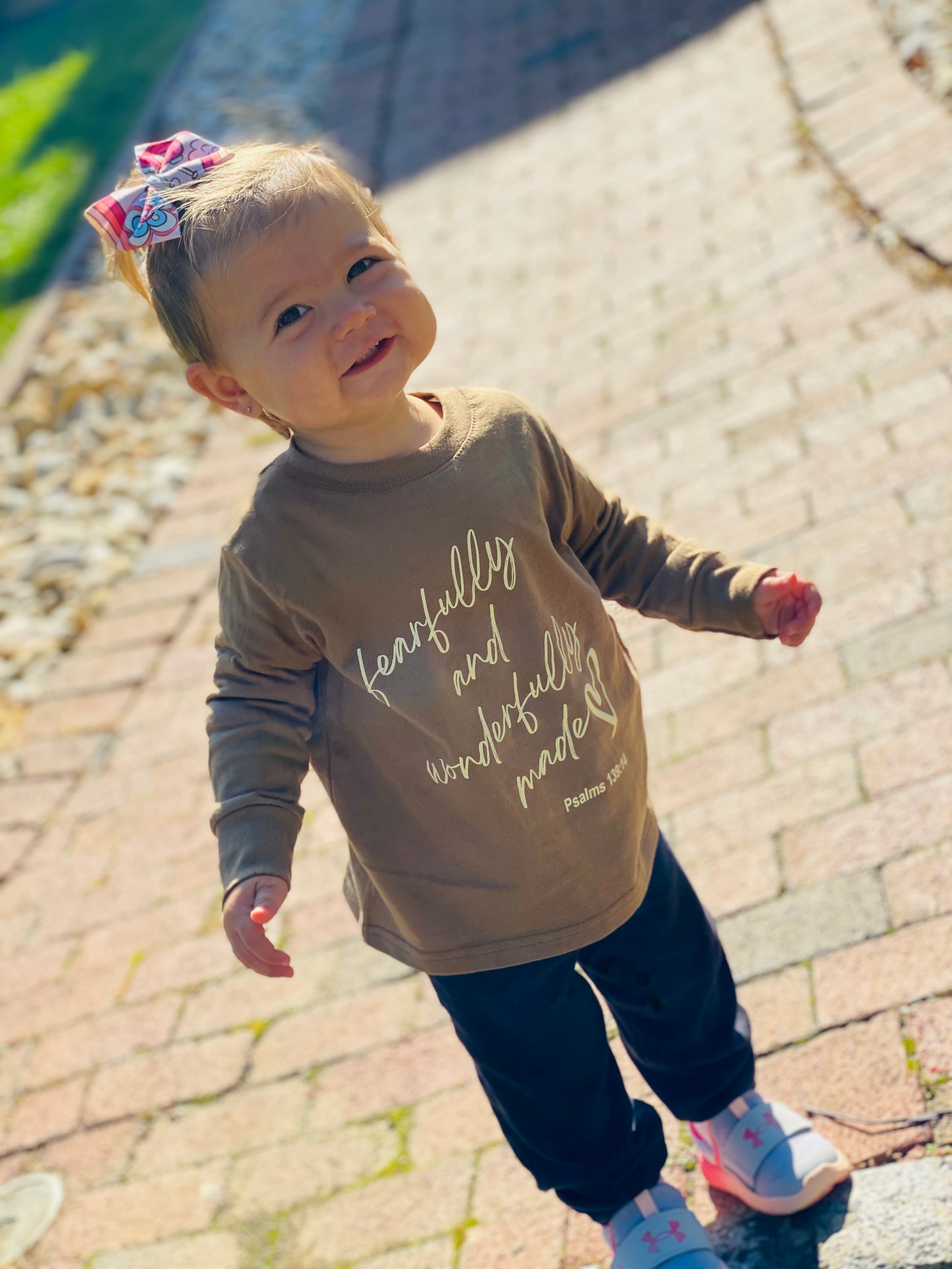 Perfect shirt for fall with its beautiful neutral coloring. Your child will wear knowing they are fearfully and wonderfully made by God.